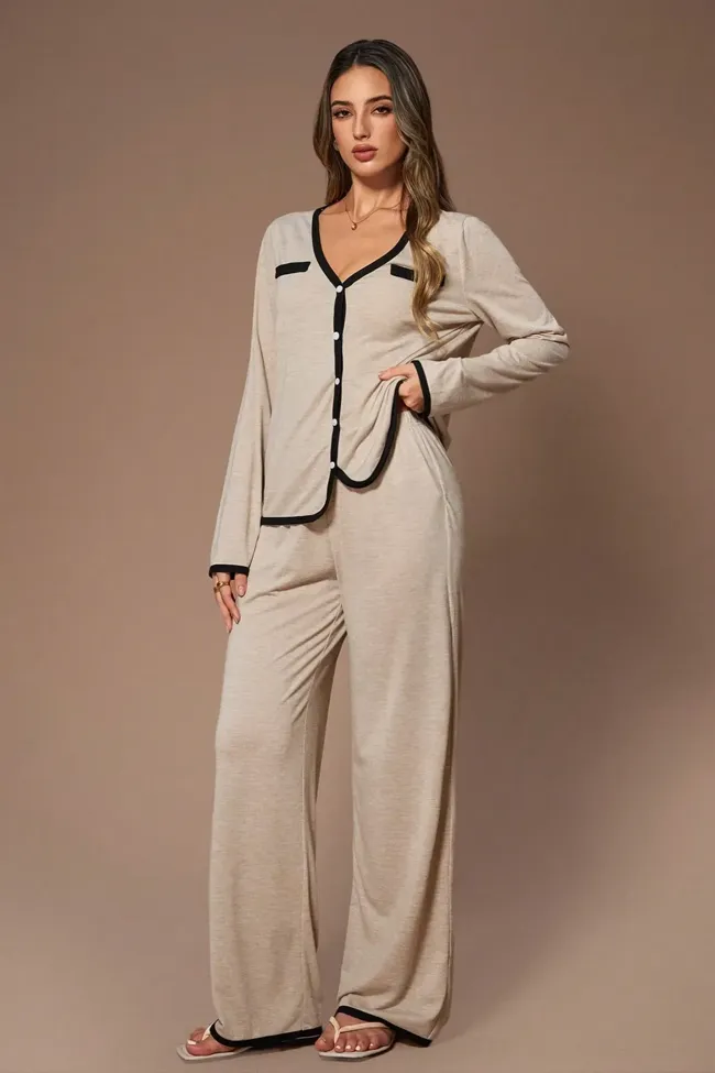 Beige Solid V-Neck Co-Ord Set