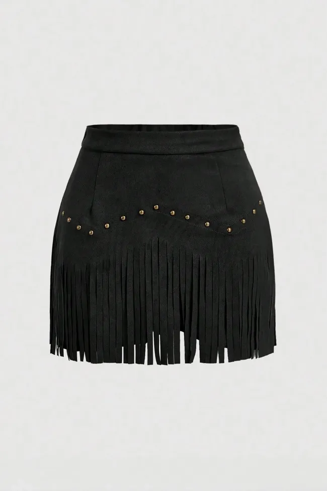 Black Fringed Studded Mini Skirt