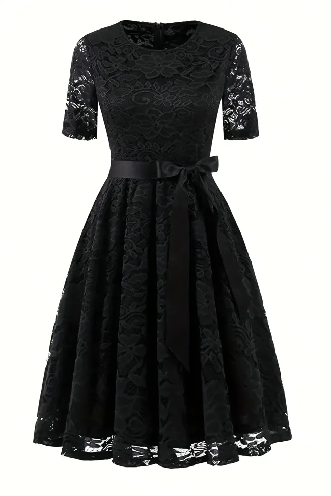 Black Lace Belted Midi Dress