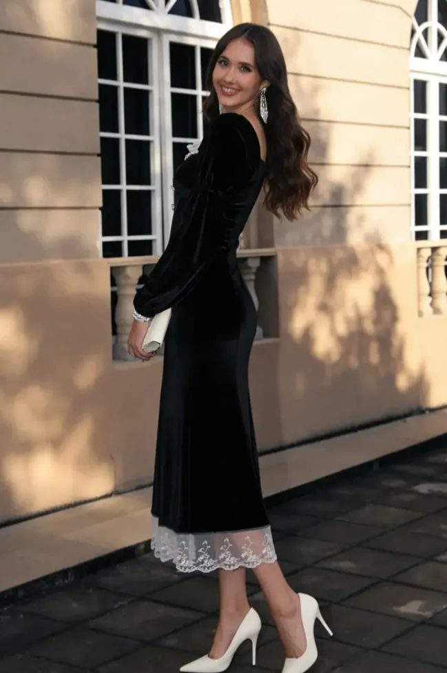 Black Lace Insert Mermaid Midi Dress