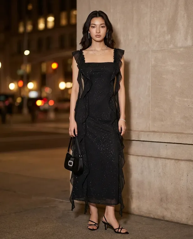 Black Shimmer Ruched Ruffle Midi Dress