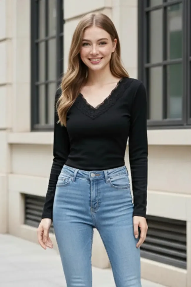 Black Solid Lace Insert T-Shirt