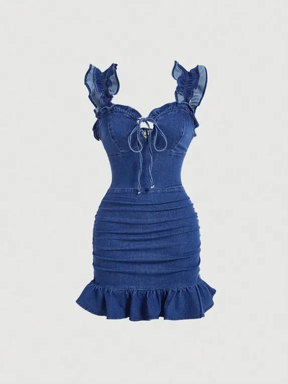 Blue Ruffles Detail Bodycon Denim Dress