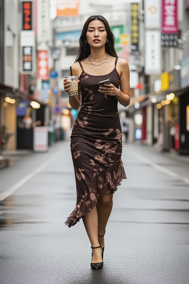Brown Abstract Scoop Neck Midi Dress