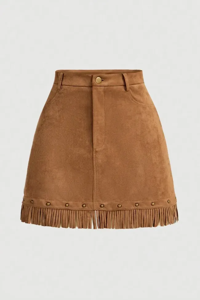 Brown Fringe Studded Mini Skirt