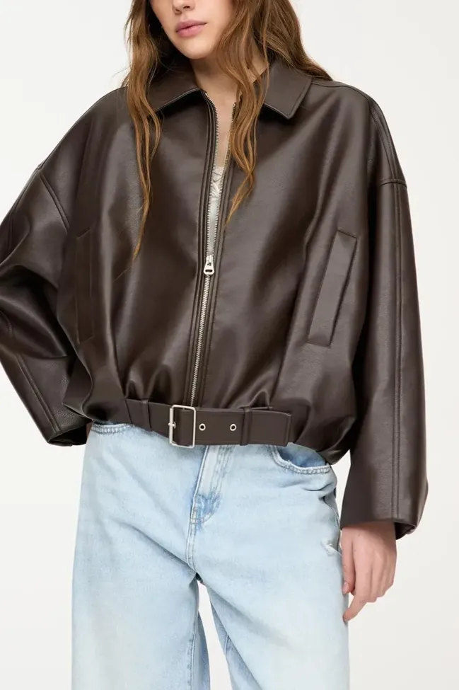 Brown Oversized Belted Pu Jacket