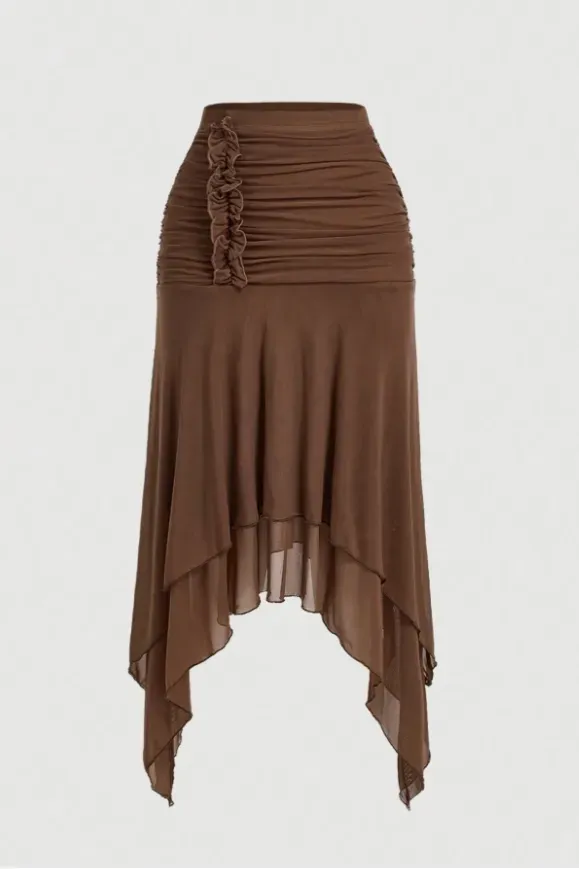 Brown Ruched Draped Midi Skirt