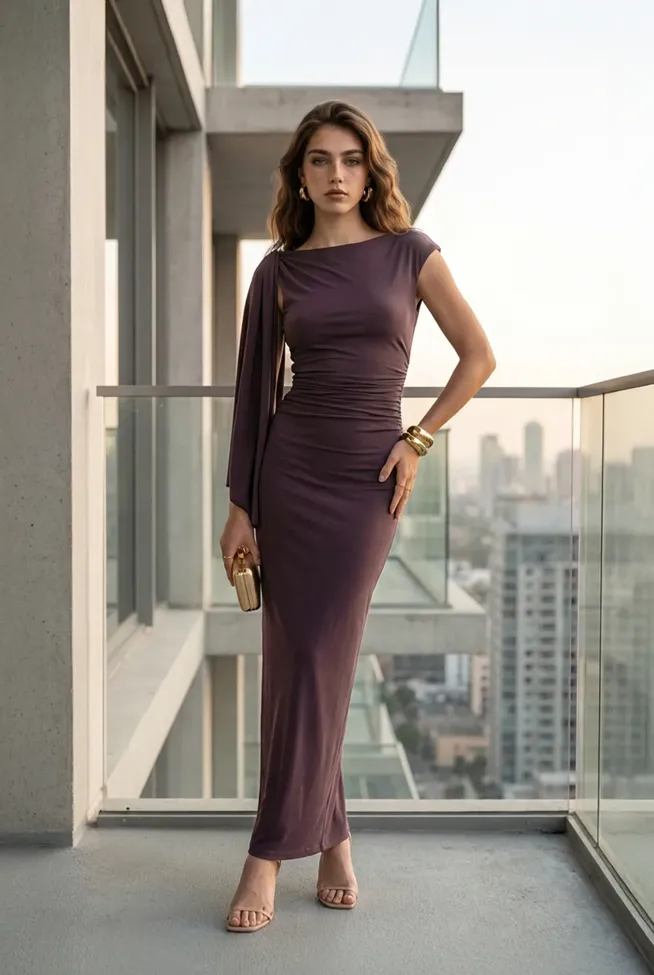 Brown Solid Boat Neck Maxi Dress