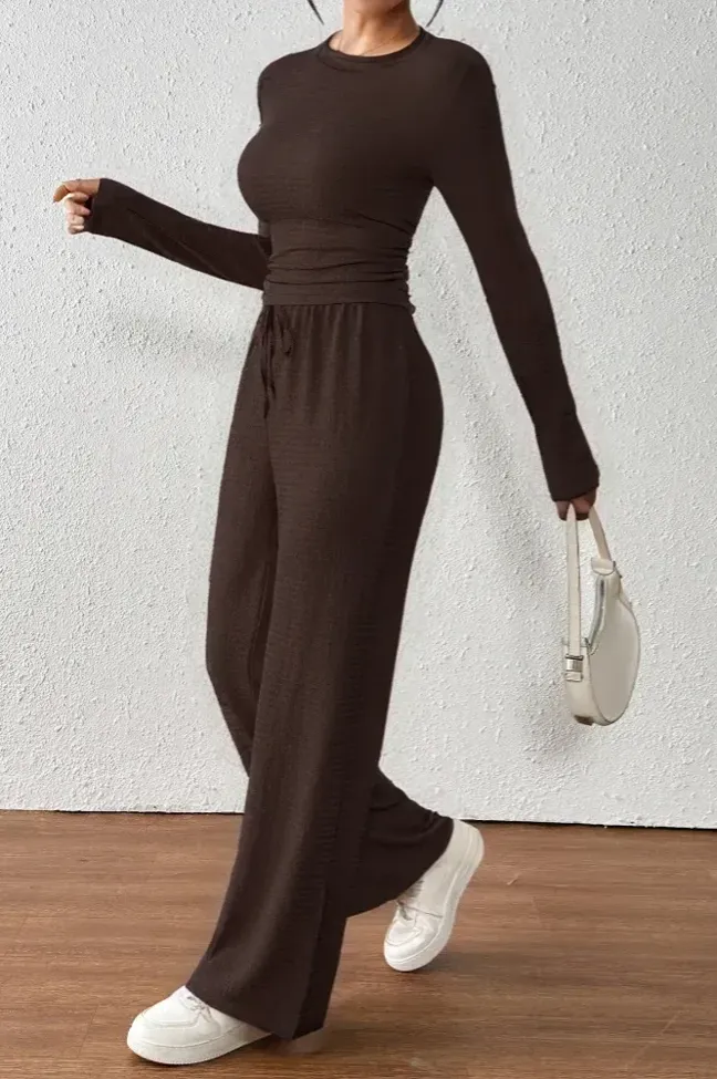 Brown Solid Crew Neck Co-Ord Set