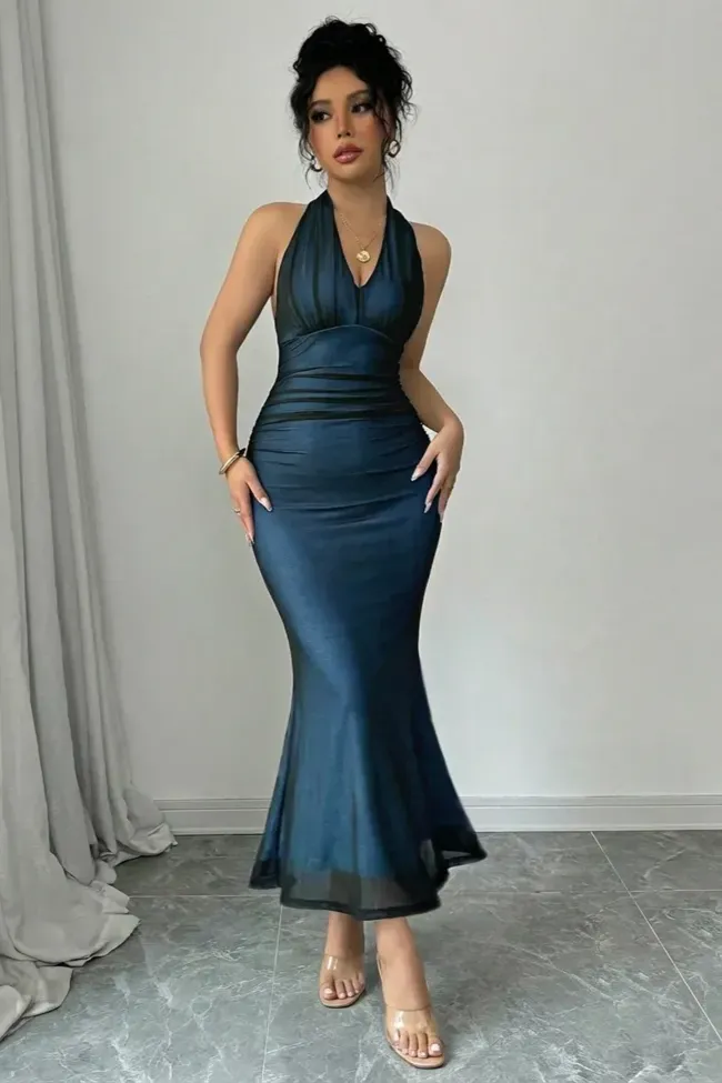 Dark Blue Backless Halter Midi Dress