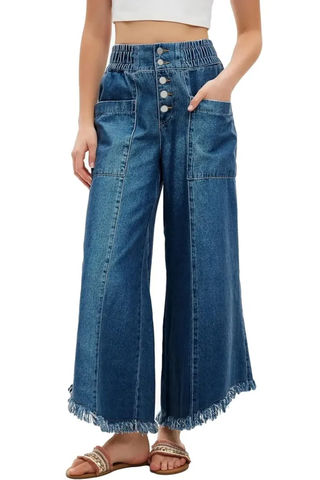 Dark Blue Fringe Wide-Leg Denim Jeans