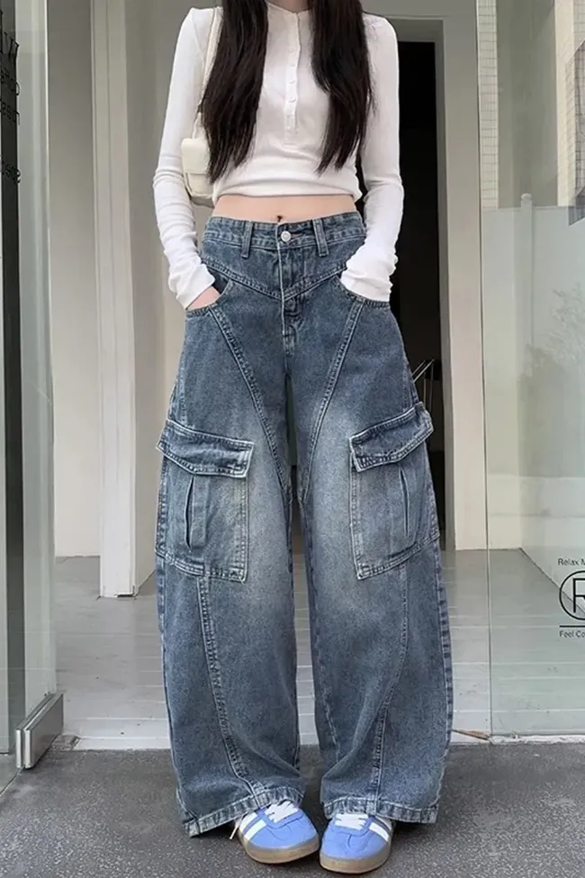 Dark Blue Wide Leg Cargo Jeans