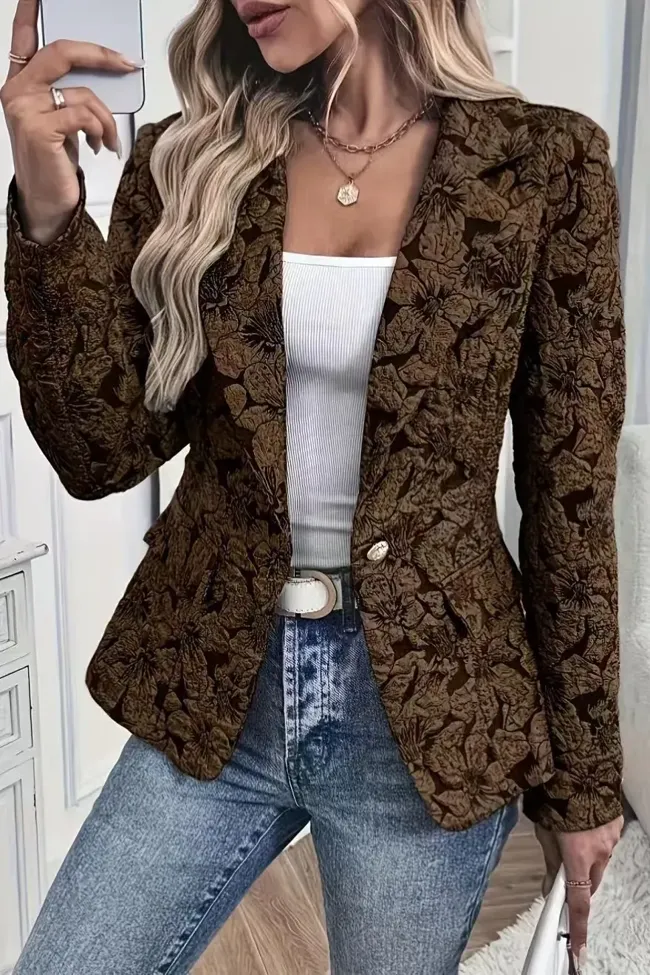 Dark Brown Embroidered Lapel Collar Blazer