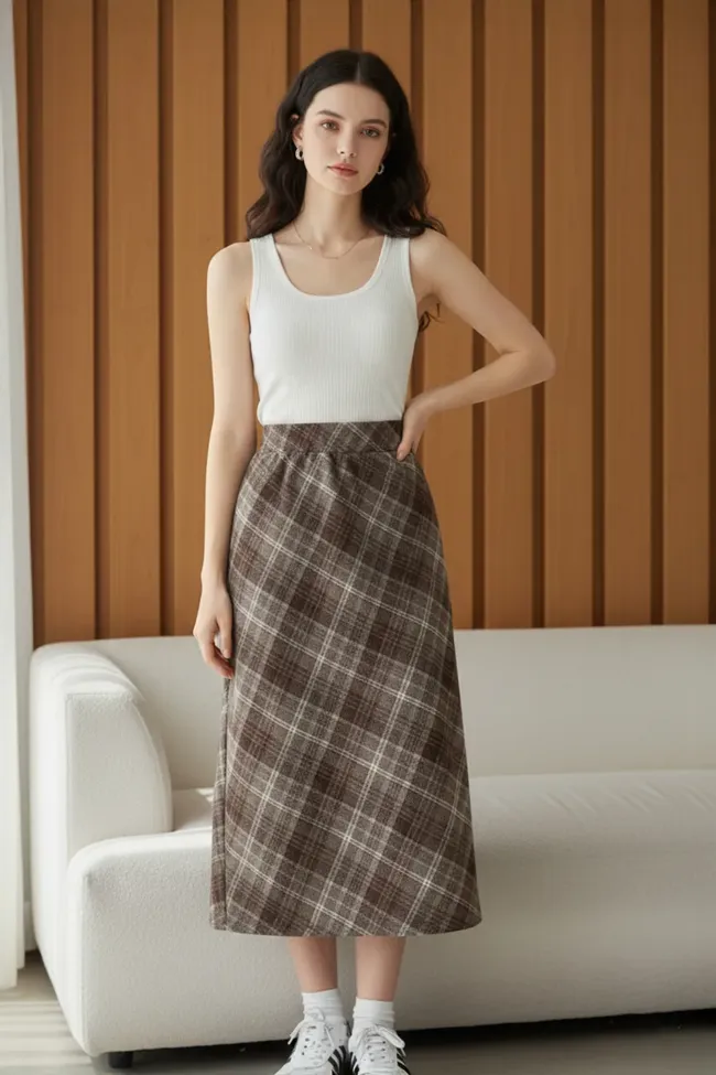 Dark Brown Plaid Aline Midi Skirt