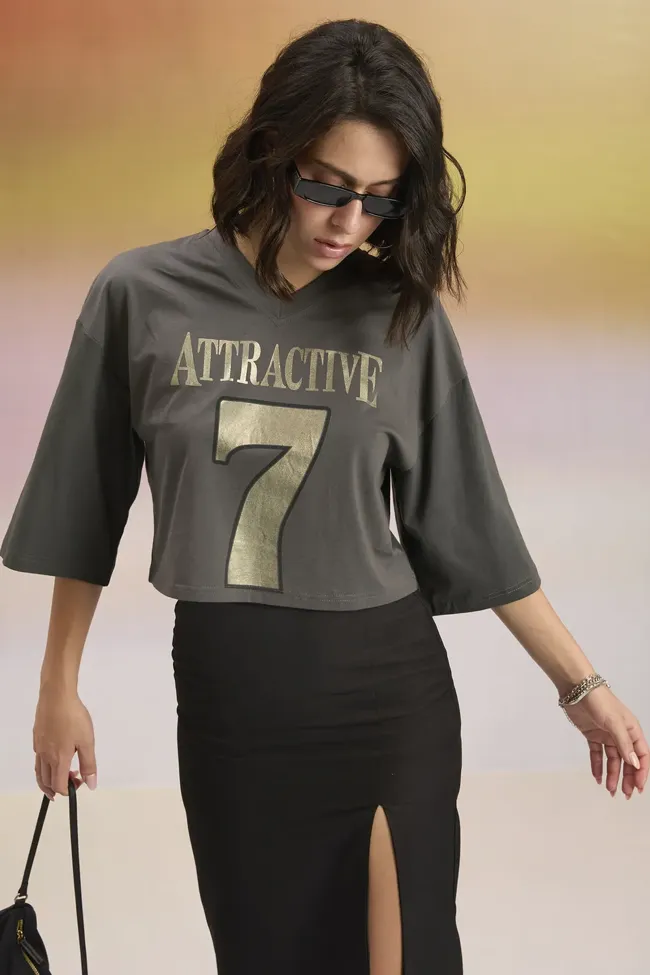 Dark Grey Graphic V-Neck Crop T-Shirt