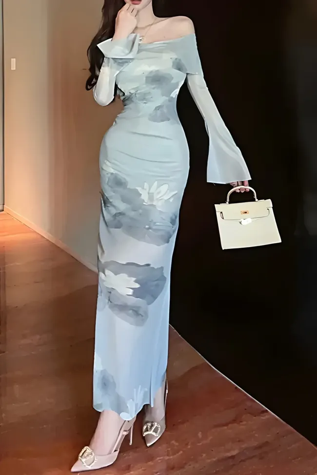 Light Grey Floral Off-Shoulder Maxi Dress
