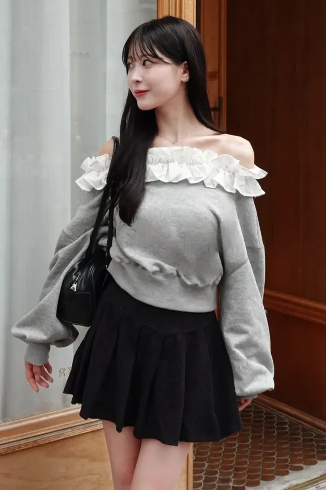 Light Grey Ruffled Off Shoulder Sweatshirt
