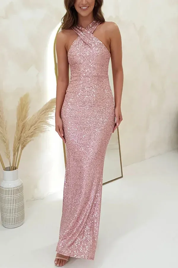 Light Pink Sequin Halter Neck Maxi Dress