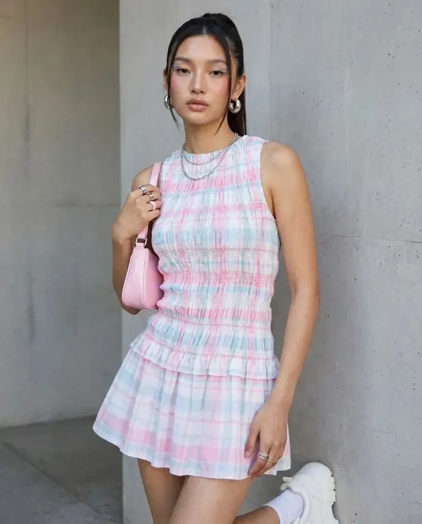 Light Pink Smocked Plaid Mini Dress