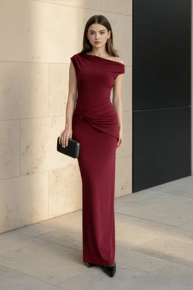 Maroon Ruched One Shoulder Maxi Dress