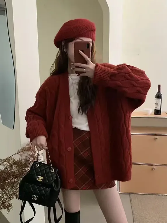Maroon Solid Cable Knit Cardigan