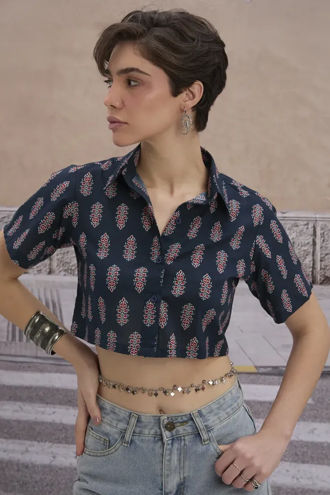 Navy Blue Ethnic Print Crop Shirt