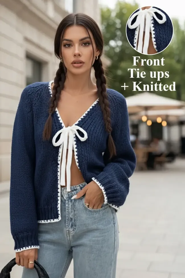 Navy Blue Tie-Up V-Neck Cardigan