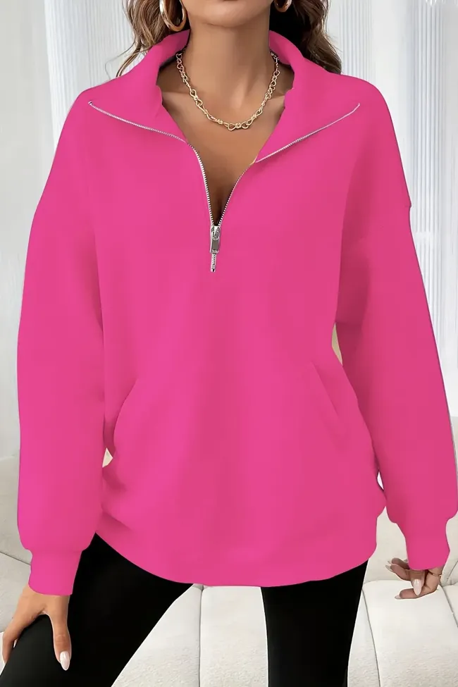 Pink Solid Zip Collar Sweatshirt