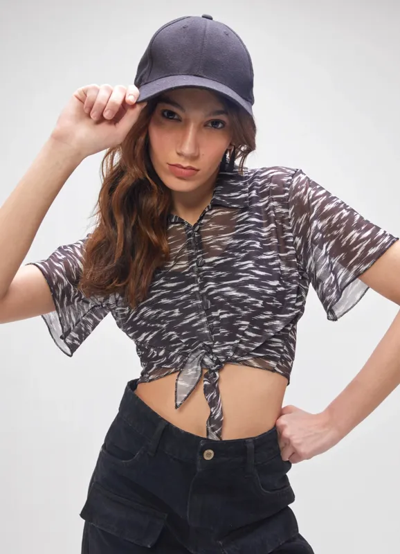 Printed Sheer Shirt With Waist Knot