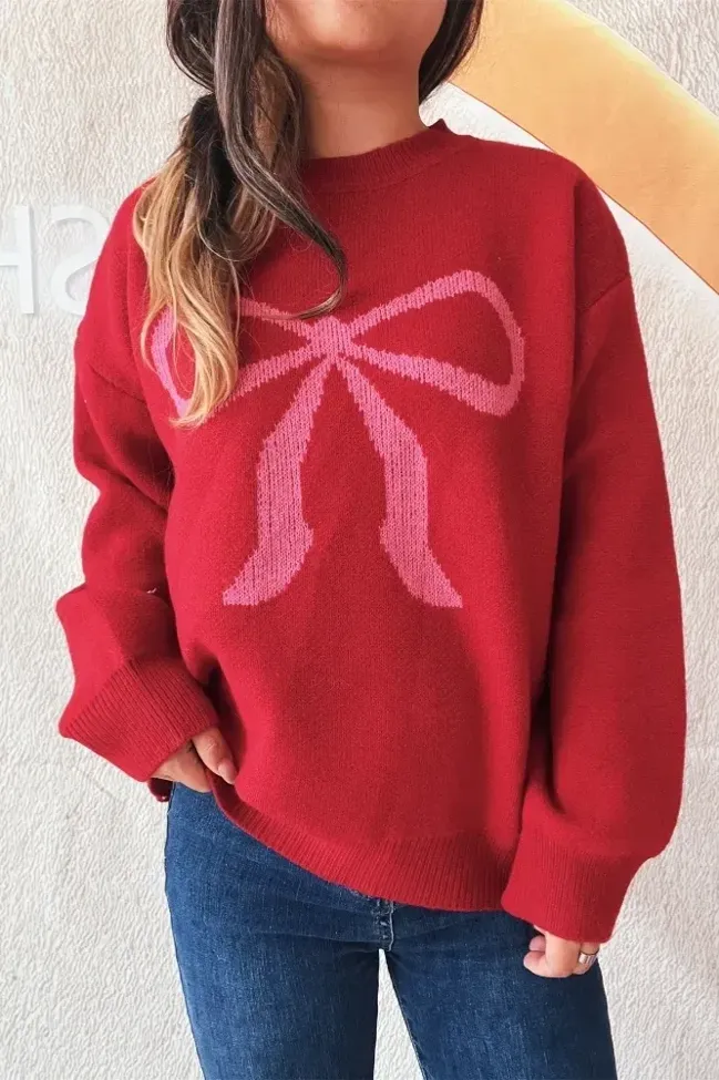 Red Bow Print Crew Neck Sweater