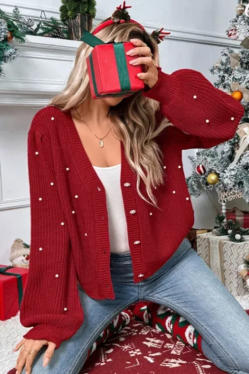 Red Pearl-Embellished Buttoned Cardigan