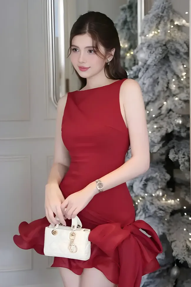Red Solid Ruffled Hem Mini Dress