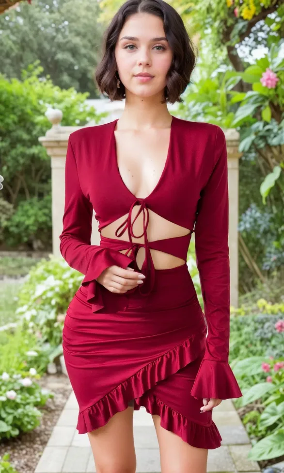 Tied Cut-Out Ruffle Trim Wrap Hem Ruched Dress