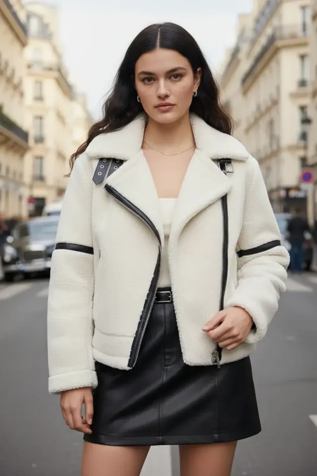 White Lapel Collar Zipper Jacket