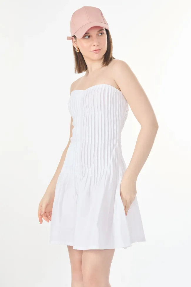 White Solid Pleated Mini Dress