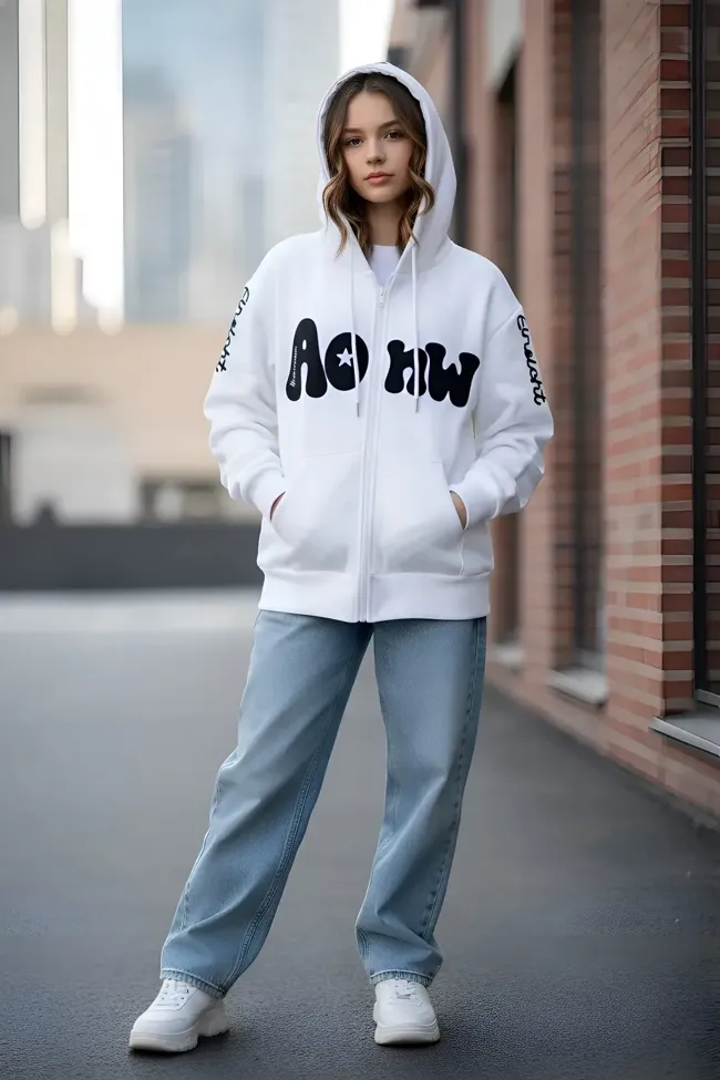 White Typography Zipper Sweatshirt