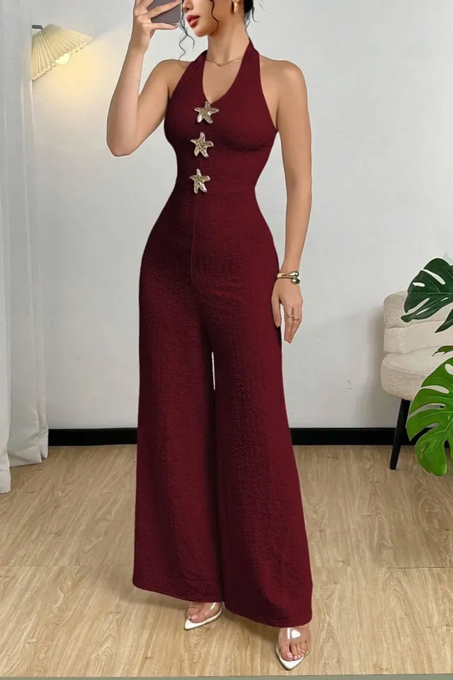Wine Solid Halter Neck Jumpsuit