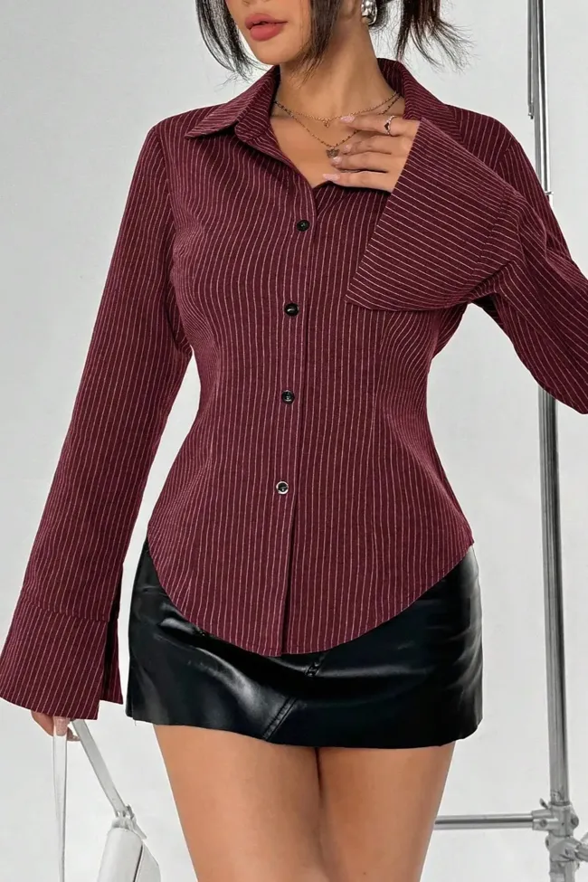 Wine Striped Cinched Waist Shirt
