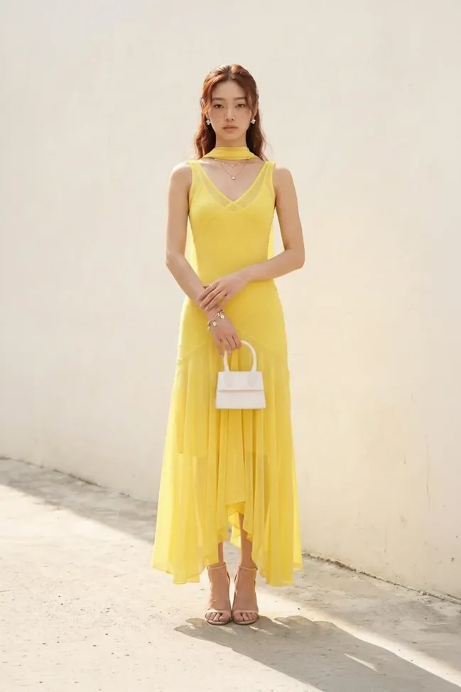 Yellow Solid V-Neck Bodycon Maxi Dress