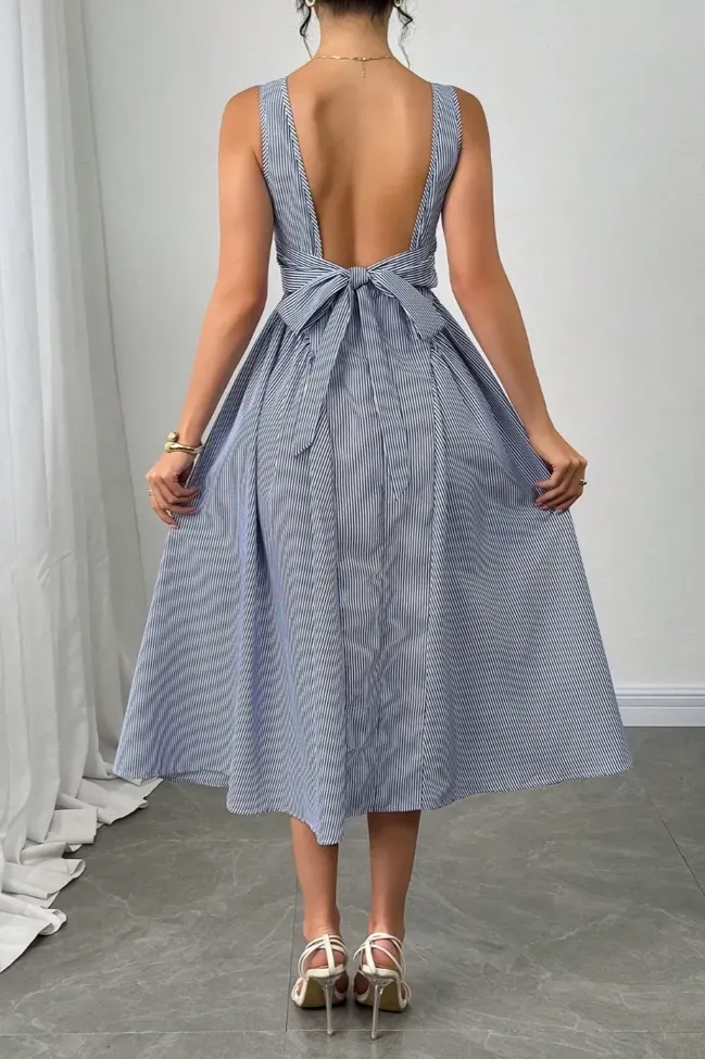 Blue Striped Backless Midi Dress