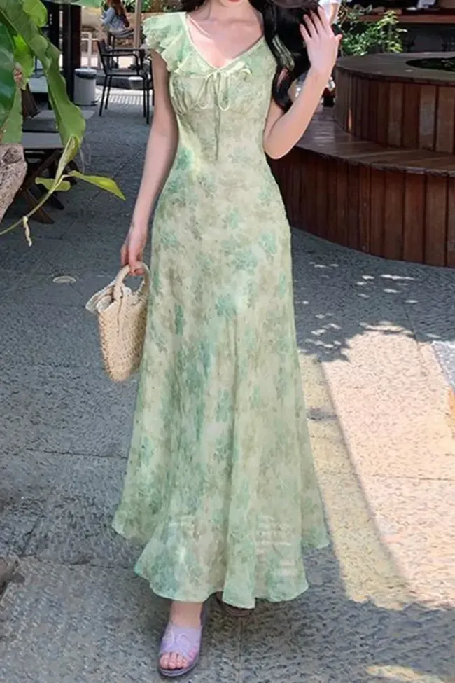Light Green Floral V-Neck Maxi Dress