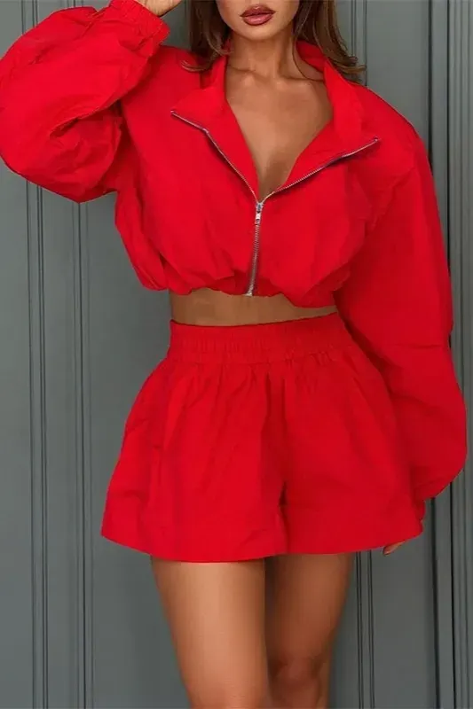 Red Zip Collar Crop Co-Ord Set